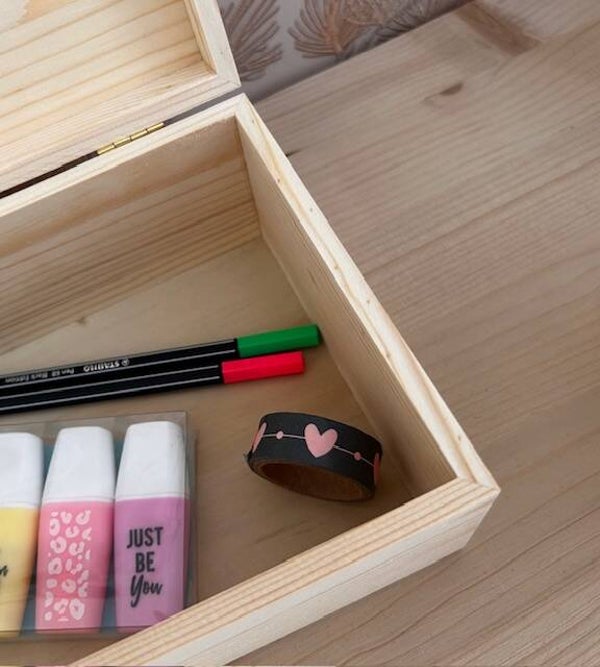 Laat je creativiteit stromen met deze vrolijke en praktische houten kist. Laat het kistje personaliseren met een naam naar keuze!